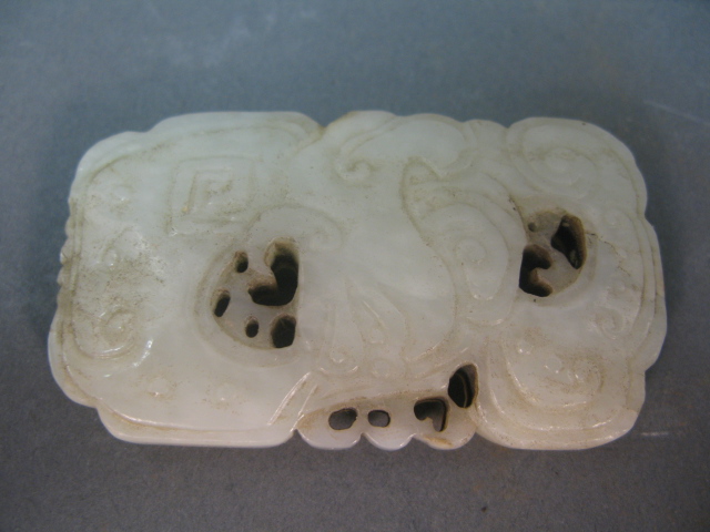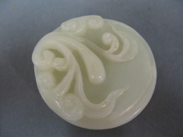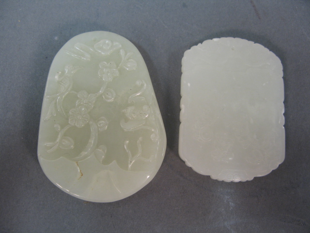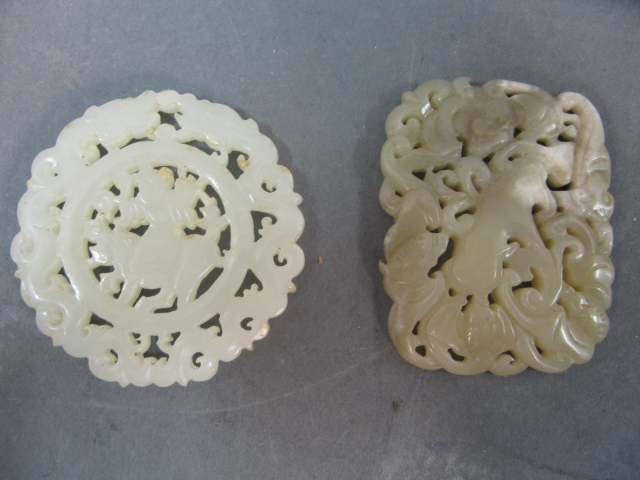 Two reticulated carved jadeite plaques one rectangle and one round.