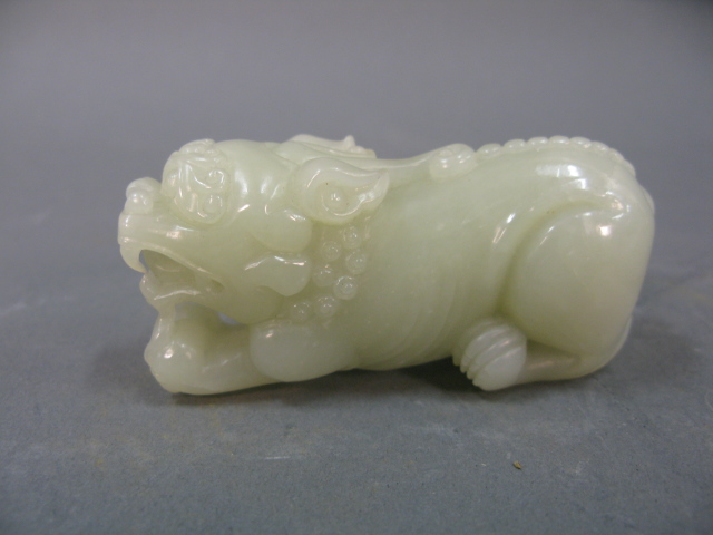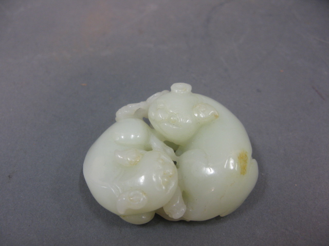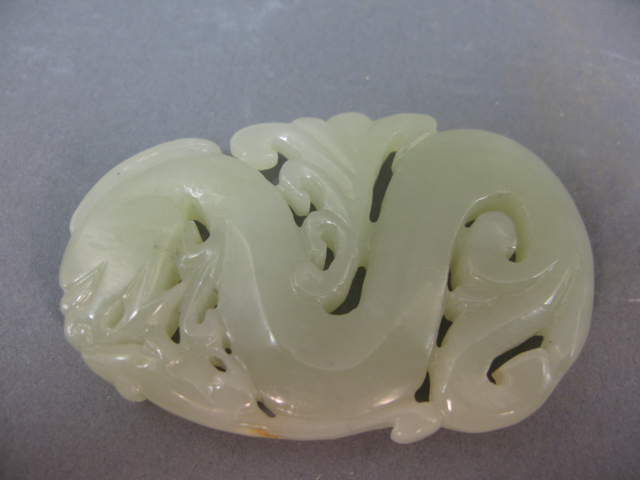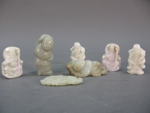Group of Jade to include two pairs of Oriental carved jade figures, two Oriental carved jade figures and Oriental carved white jade dragon.