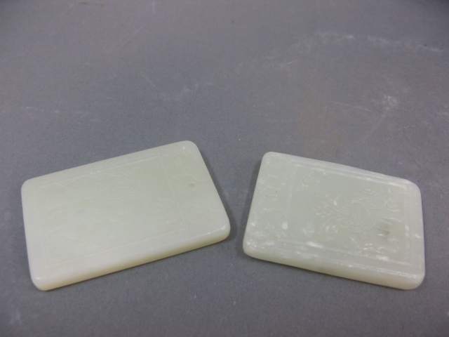 Two jadeite carved plaques one with elephants and the other with two figures next to bull.