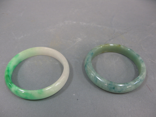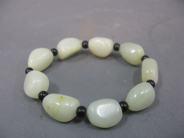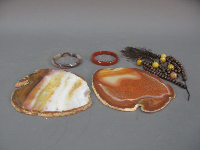 Pair of thinly sliced red agate in form of fish, two Oriental agate bracelets and yellow jadeite with wooden bead necklace.