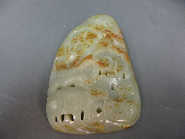 Carved jadeite celedon with russet spots, carved in the form of a scenic view with trees and animals