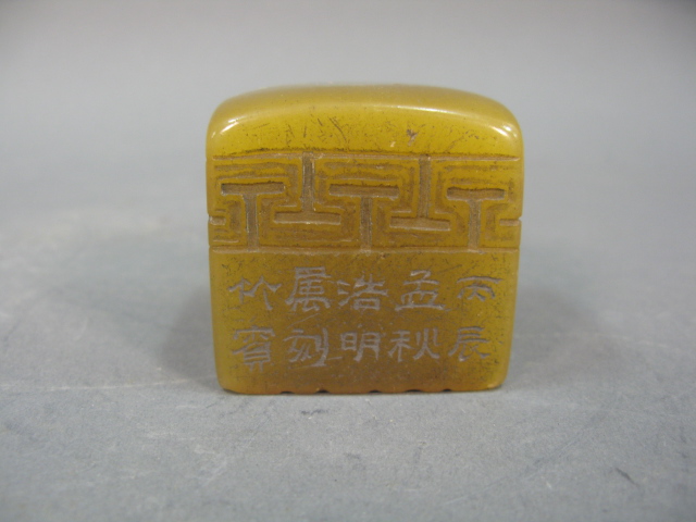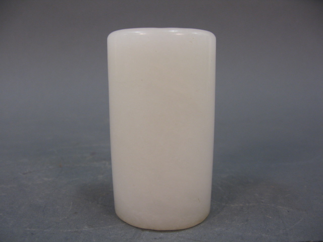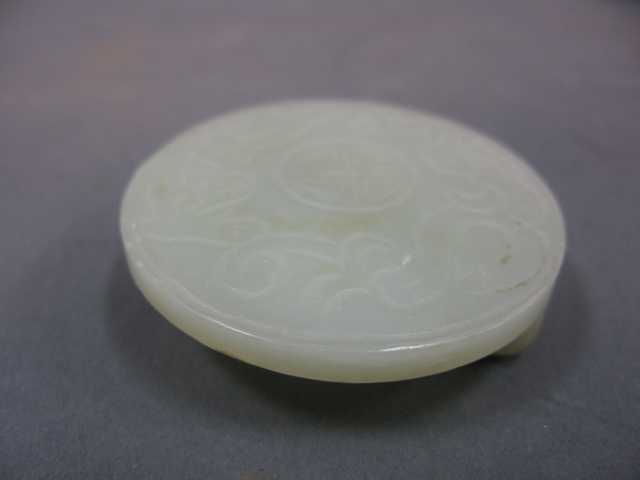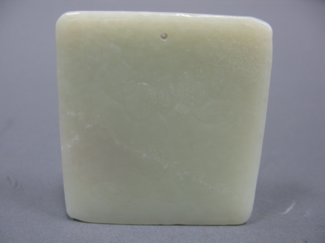 Jadeite seal with carved loop handle on top having carved bats and designs