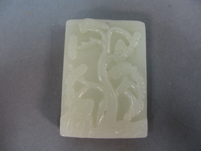 Two jadeite pendants one of boys playing and the other carved with bird in three.