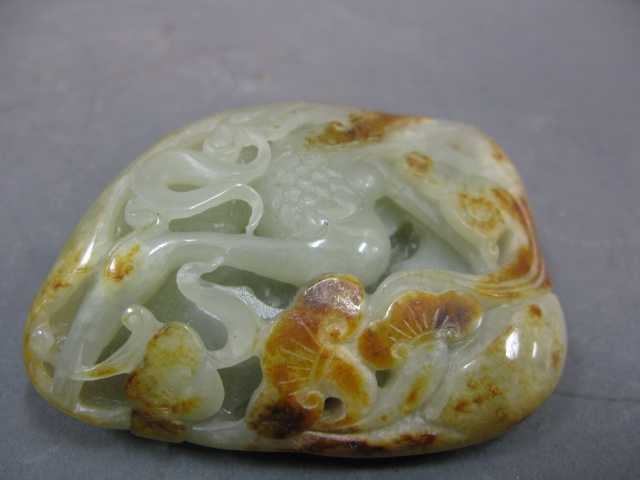 Carved celadon jade boulder of peacock and lotus having russett spots.