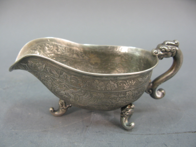 Silver phoenix bird creamer having phoenix bird and wild flower designs and dragon handle and feet.