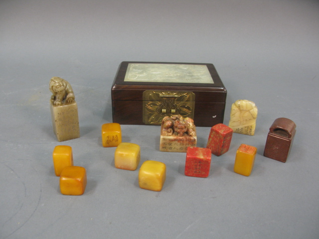 Wood lift top box with carved stone top and twelve soapstone seals inside.