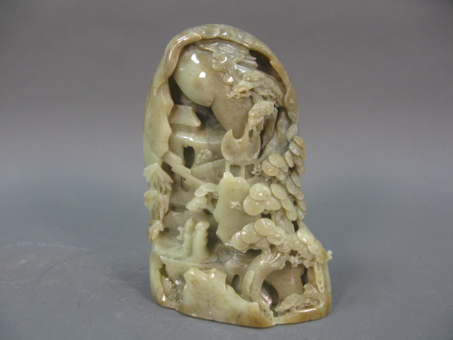 Large carved jade boulder carved in the form of a mountainous landscape with pine trees and figures inside.