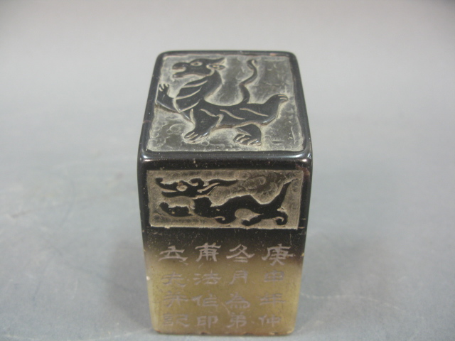 Small soapstone seal having five carved dragon panels and carved characters on the front, bottom half is grey to black color.