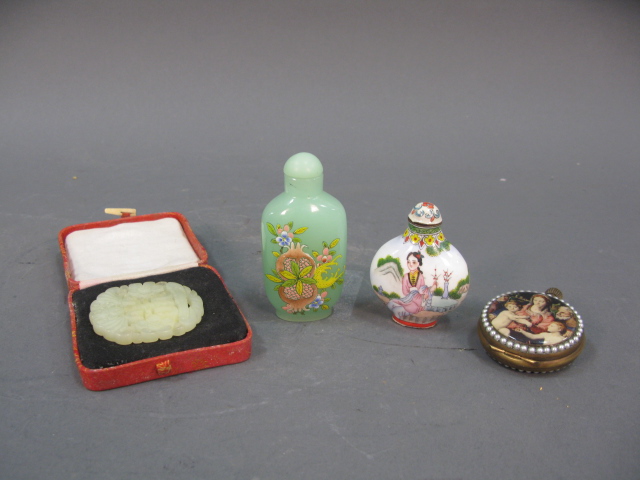 Four piece lot Oriental white jade pendant, enameled glass snuff bottle, enameled over copper snuff bottle and Omega pocket watch.