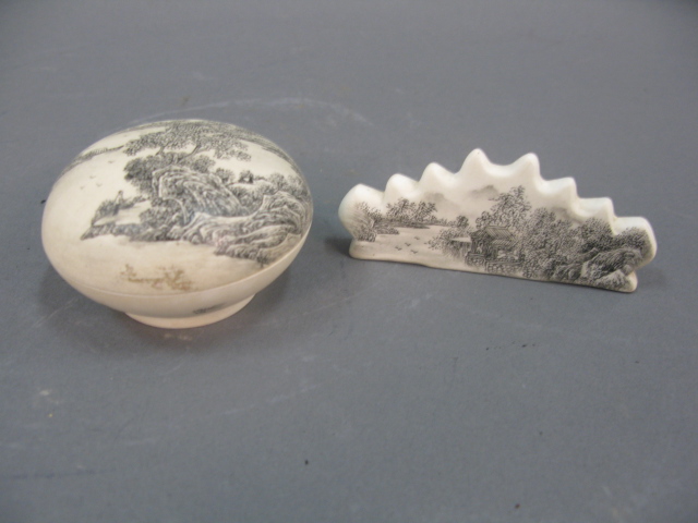 Set of two unglazed ceramic scholar’s objects: ink box and brush holder.