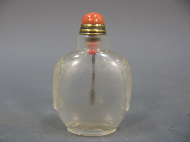Oriental crystal snuff bottle with etched ends and coral stopper.