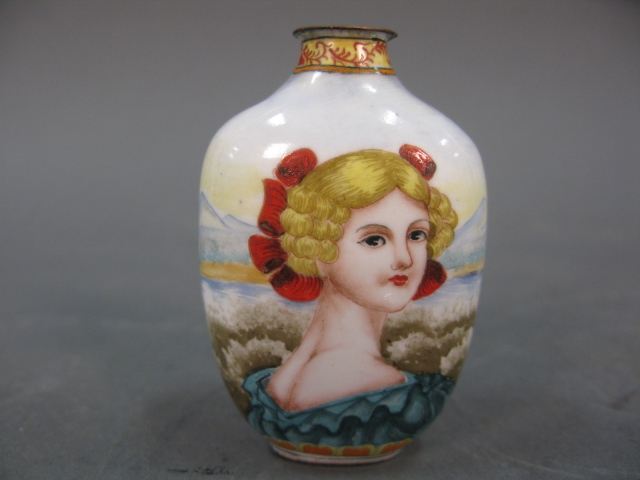 Enameled over copper snuff bottle with a painted bust of a woman on each side.