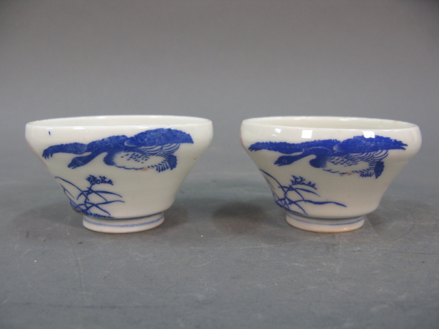 Two porcelain tea cups, in under-glazed fresh red and blue with floral design.