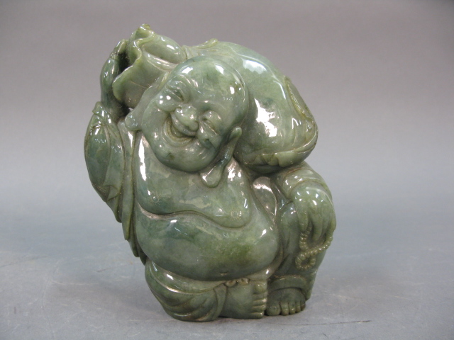 Large spinach green jade Buddha figure holding a tied bag across his shoulders.