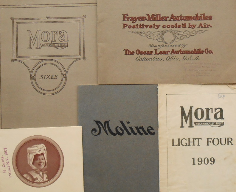 Five catalogs – 1906 Frayer Miller, 1908 Moline, two different 1908 Mora, and 1909 Mora Light Four