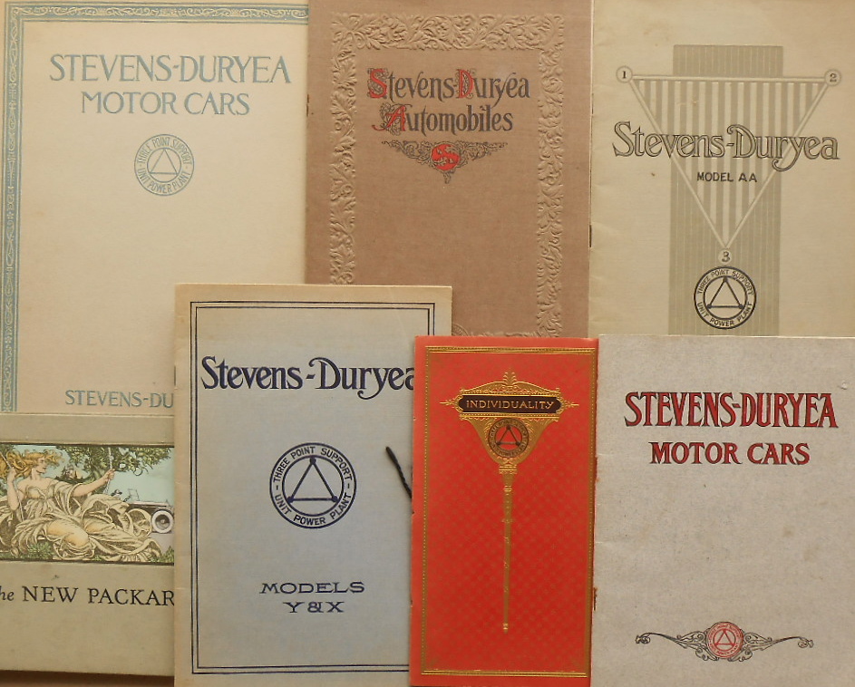 Six Stevens Duryea items – 5 cat, 1909, 1910, 3 diff 1912, small 1915 portfolio & 1915 Packard twin Six cat