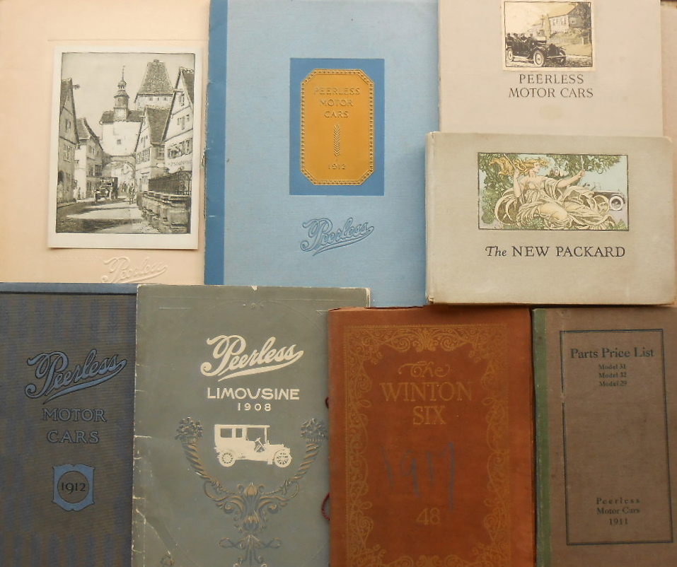 8 items – Peerless, 1908, 1911, 3 diff 1912, 1913 cat, 1917 Winton, 1918 Packard cat, 1911 Peerles Parts List