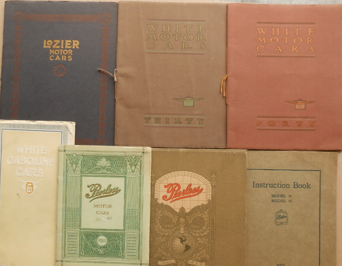 Six catalogs – 1913 Lozier, 1911, 1913 Peerless, 1912, 2 diff 1913 White & 1911 Peerless Instruction Bk