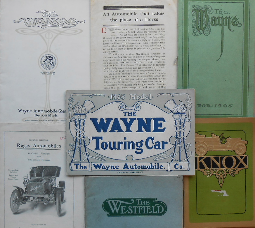 5 cat – 2 diff 1905, 1908 Wayne, ca 1902 Westfield, 1908 Knox – 2 fldrs – 1904 Regas, 1906 Success