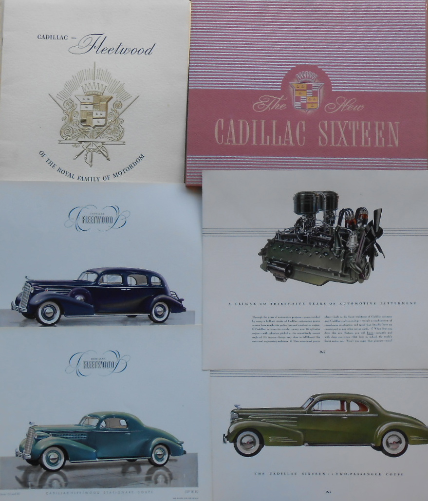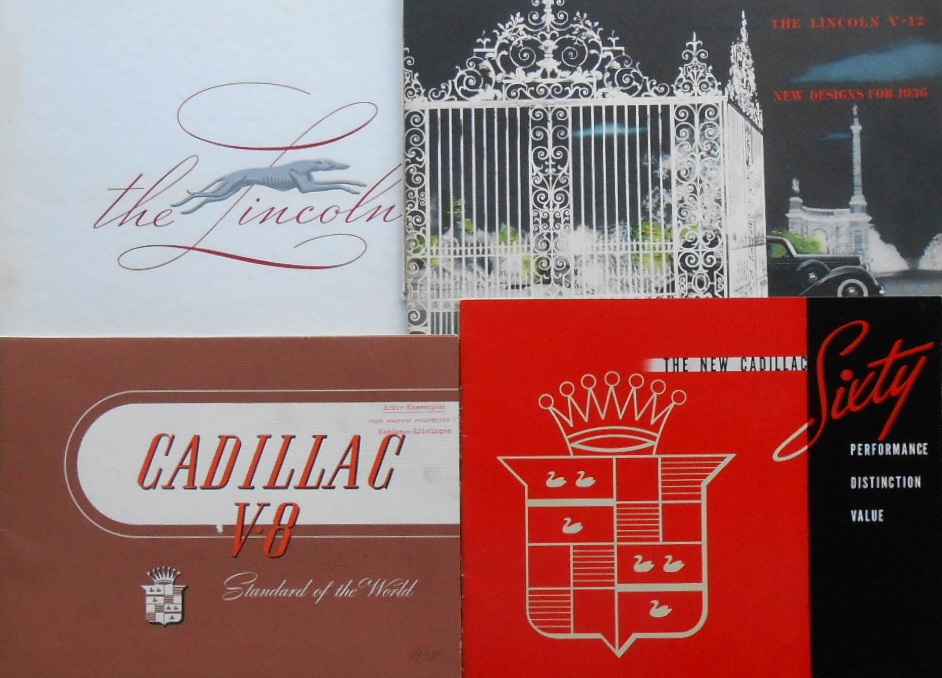 1938 Cadillac 60 catalog, 1938 Cadillac portfolio, 1936 and 1938 Lincoln Mod K catalogs