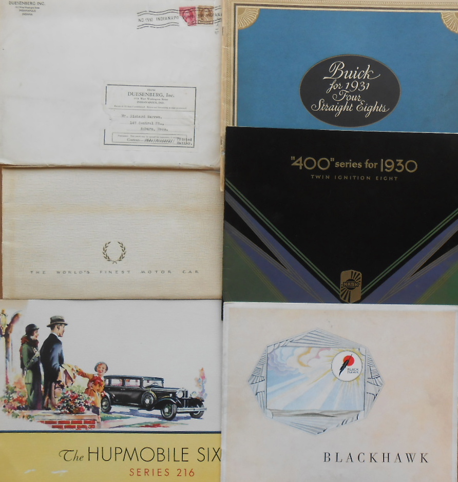 5 cat – 1931 Duesenberg, orig envelope, 1930 Nash 8, 1931 Buick, 1929 Stutz Blackhawk, 1932 Hupp 216