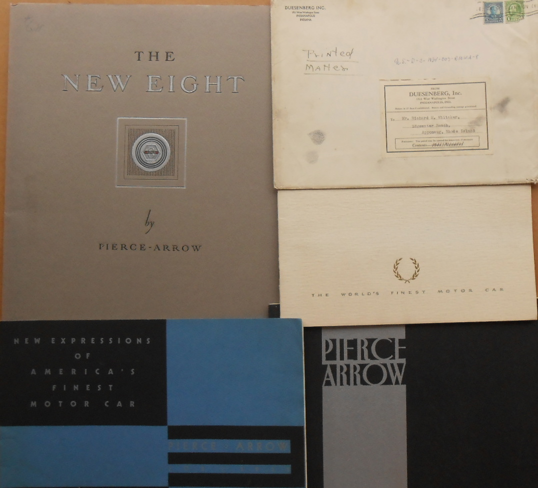 4 items – 1932 Duesenberg cat/ orig env, 1931 Pierce Arrow lg and sm catalogs, 1932 Pierce Eight lg cat