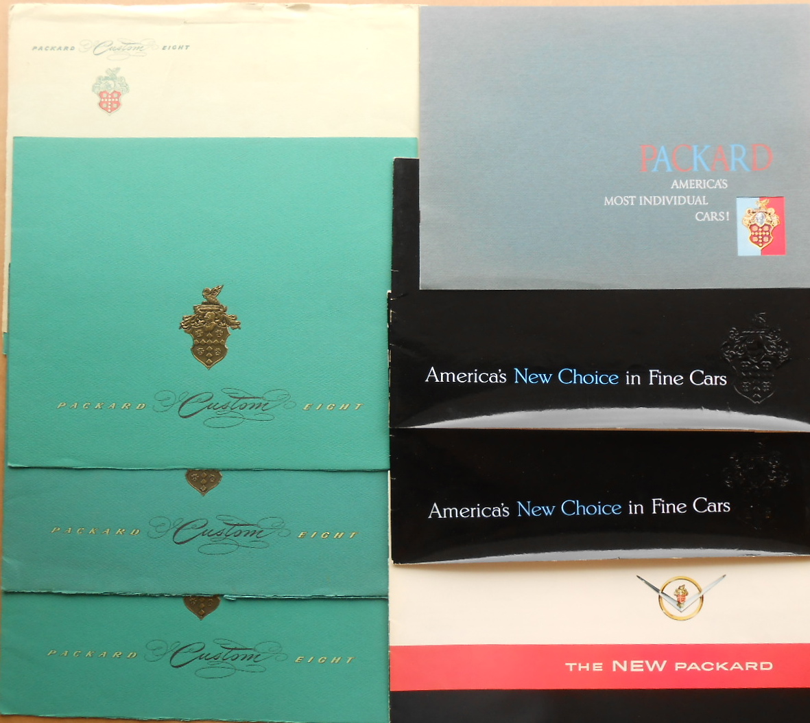 8 large Packard catalogs – four 1948 Custom Eight, 1953, two 1954, 1955, some with orig env