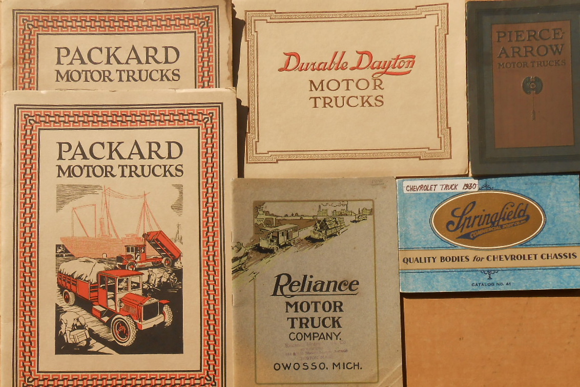 6 truck – 2 lg 1920 Packard, ’10 Reliance, ’11 Durable Dayton, ’14 Pierce loose cover, ’30 Chev Spfd Body