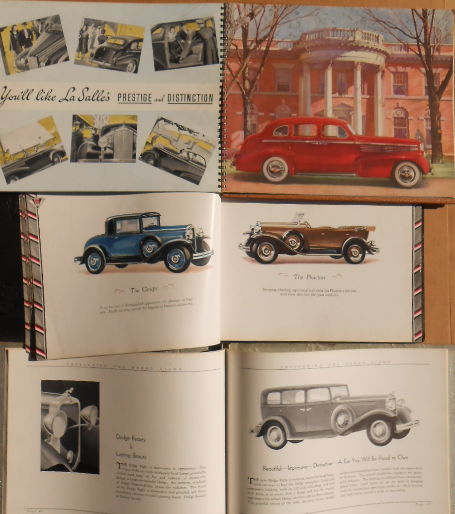 3 dealewr albums -1930 Hupmobile, 100 pgs, 1932 Dodge 6 & 8, 1938 LaSalle easel stand