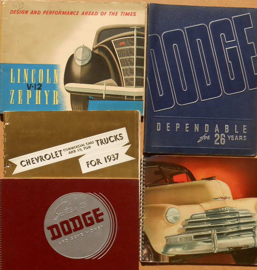 1937 Chevrolet truck, 1947 Chevrolet, 1938 & 1940 Dodge, 1937 Lincoln Zephyr dealers albums