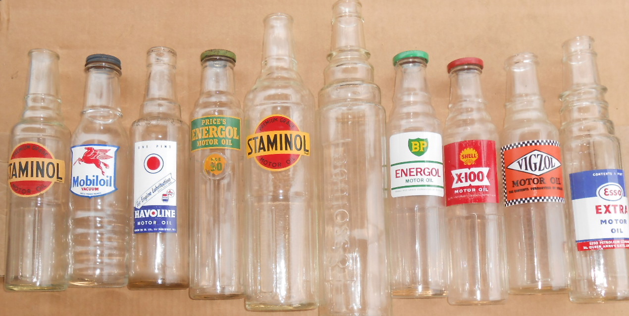 Twenty four mixed pint and quart bulk oil bottles & seven oil cans in two boxes