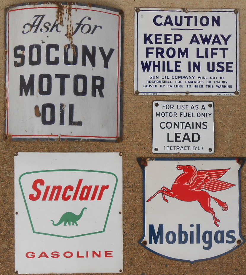5 gas pump related signs – Sinclair 12×13, Mobilgas 12×12, Socony 13×15, caution 12×10, contains 7×6