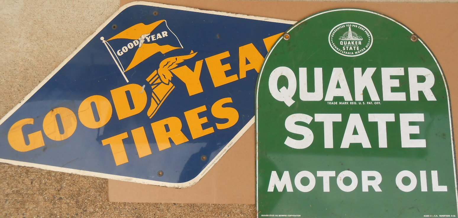 Two signs – Goodyear 48 x 27 and Quaker State, double sided 26 x 19
