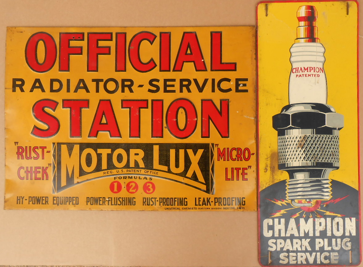 Two signs – Champion Spark Plug 10.5 x 27, Motor Lux 26 x 19