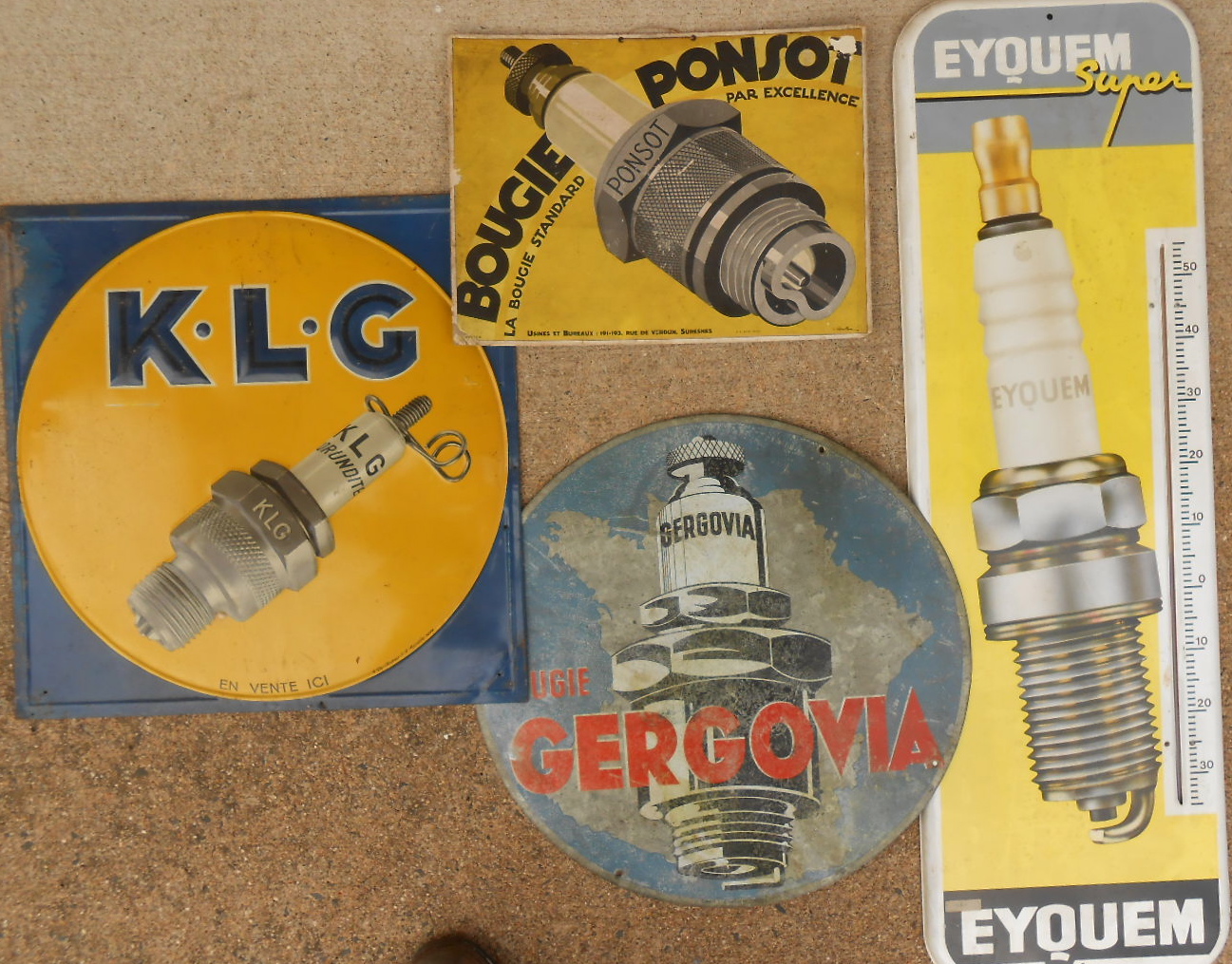 Four spark plug signs – Eyquem thermometer 12 x 36, KLG 19 sq, Bougie 15 x 12, Gergovia 19 dia