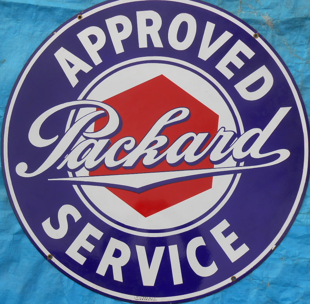 Packard double sided porcelain sign, signed Walker, appears to be NOS, 42 inch dia