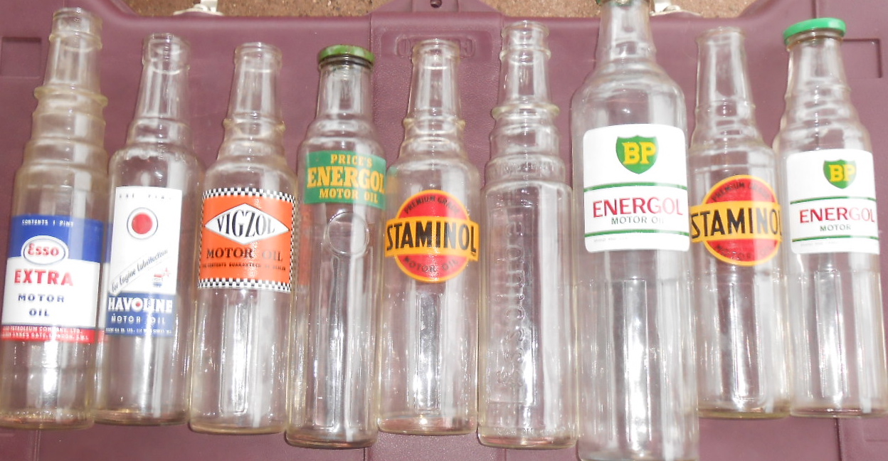 Lot of 29 pint and quart oil bottles, some with painted labels