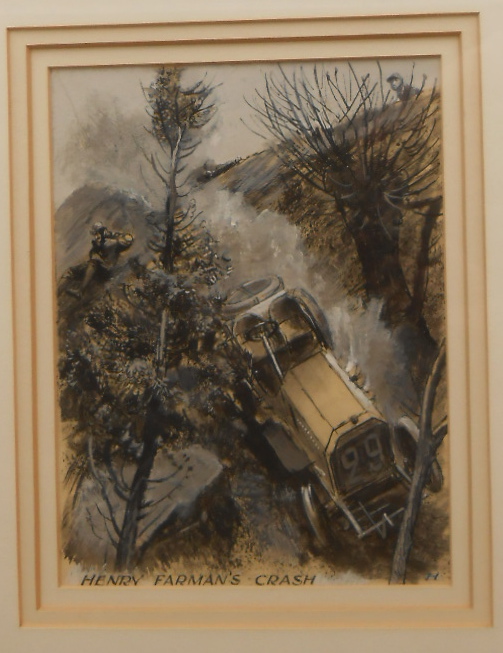 Peter Helck final artwork, pg 32 Check Flag, Henry Farman’s crash, 1905 Gordon Bennett, image 8×10, frame 17×21