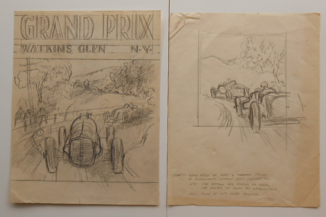 Two Peter Helck preliminary sketch, on for the 1948 Watkins Glen program cover, 8.5 x 11 each
