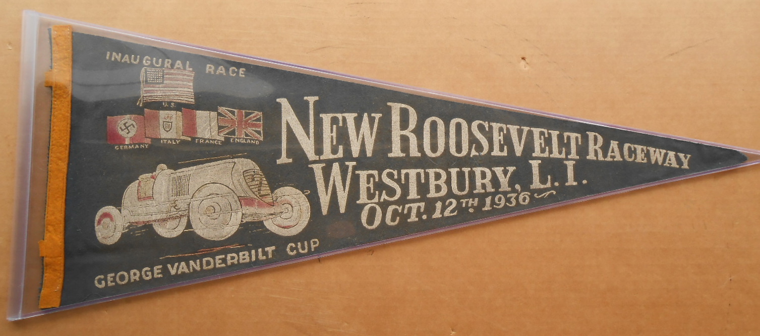 1936 Long Island Vanderbilt Cup, Inaugural International race felt pennant, 28 x 11