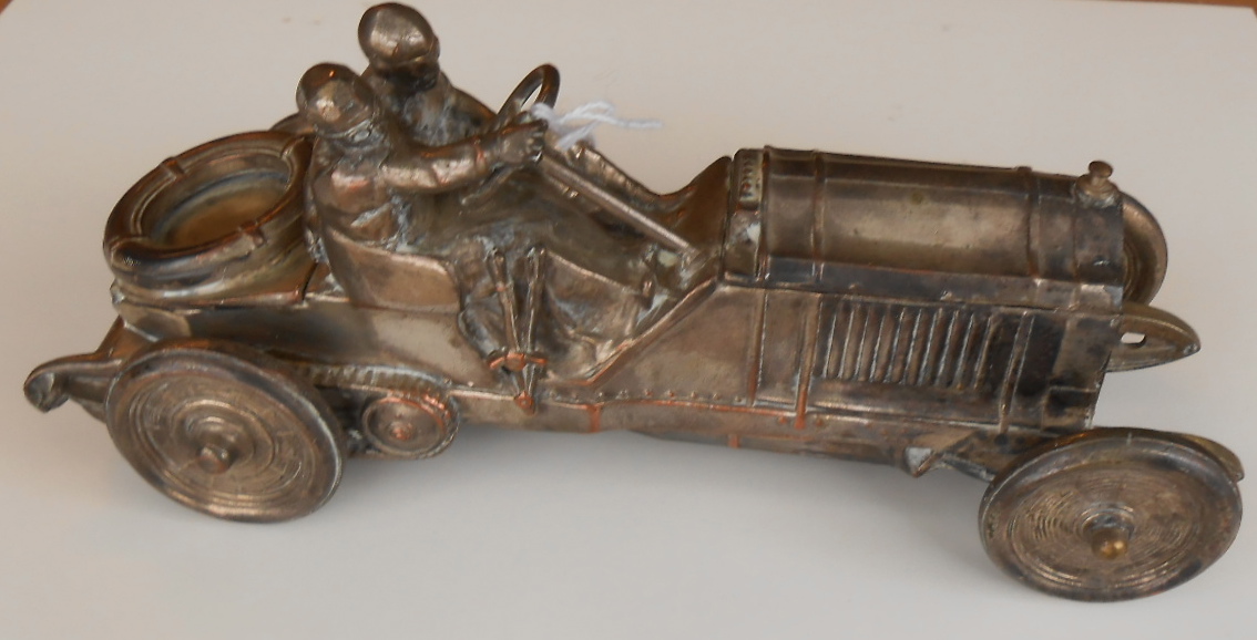 Ca 1908 Brasier desk sculpture, hood and rear open, cast bronze, 9 inches lg