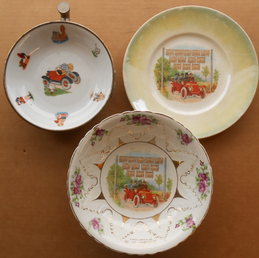 Three ceramic auto theme china dishes, child’s hot plate and two 1911 calendar plates