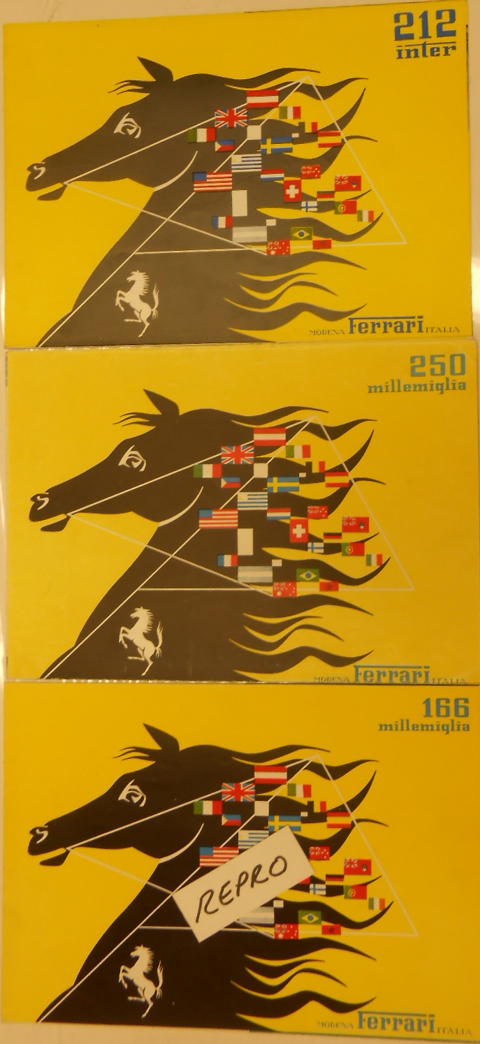 Two original Ferrari broc – 1953 166 MM, 1953 250 MM, each opens to 13 x 19 & 212 Inter repro