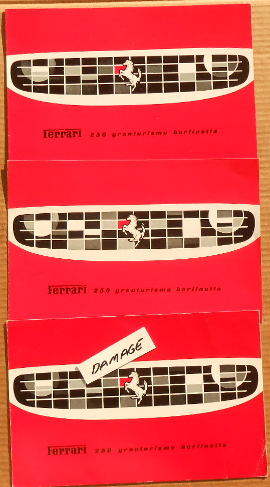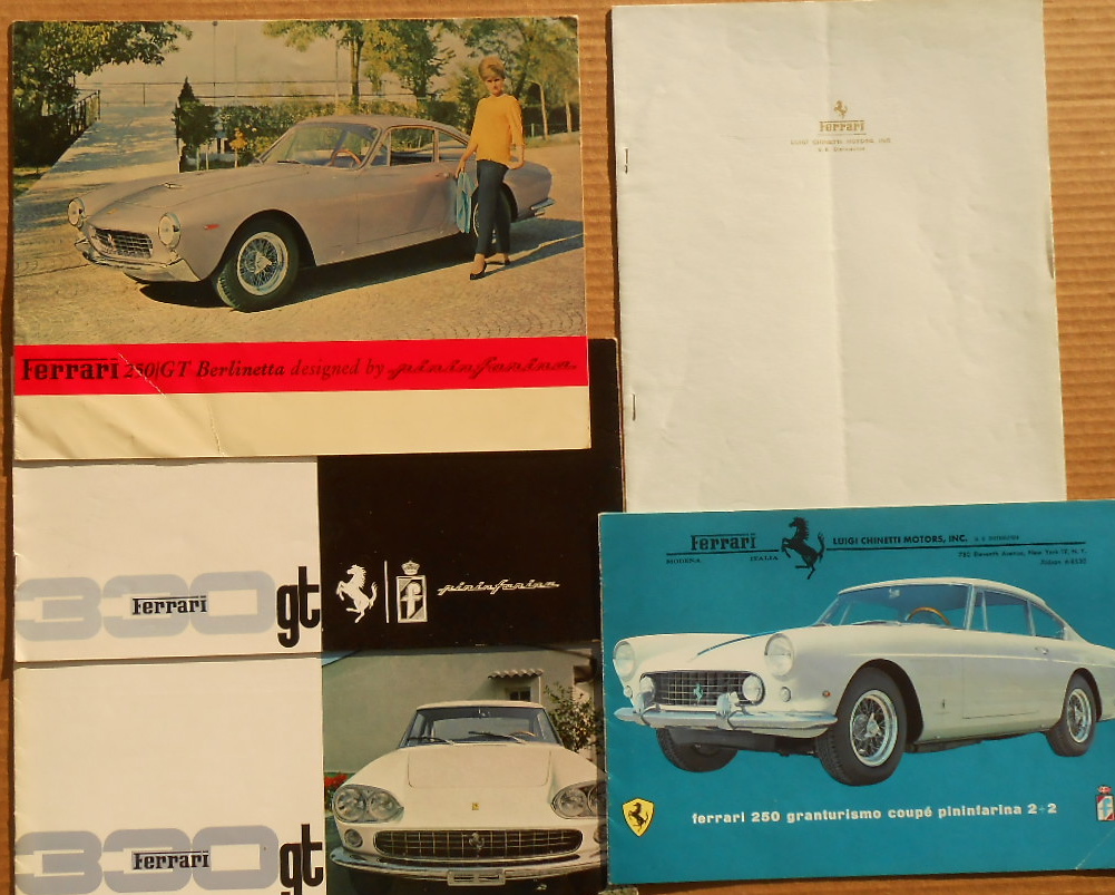 5 Ferrari broc ca 1963-66 – 250 GTE, 250 Lusso, white Chinetti fldr, 330 GT slanted light, 330 GT b & w cover
