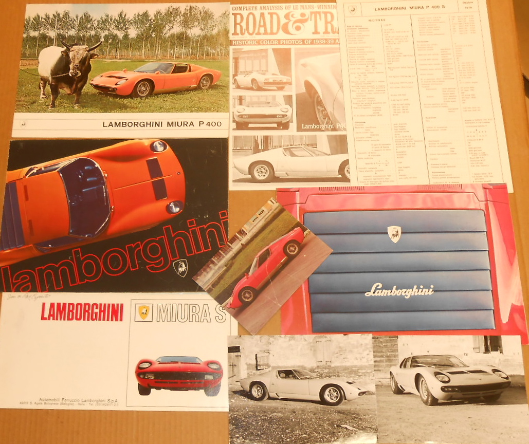 8 Lamborghini Muira items – 5 brochures, Road Test, post card, 2 factory photos