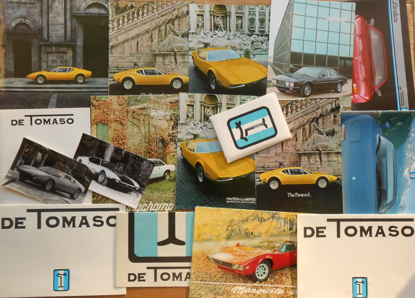 DeTomaso items, 1970’s and later – 14 brochures, two photos, one single sheet, one postcard set