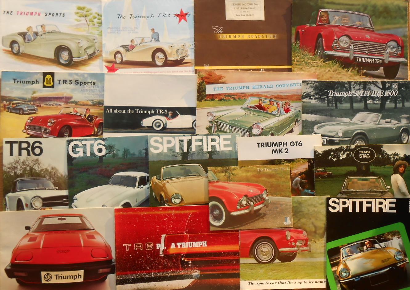52 Triumph brochures – TR 2, 3, 4, 5, 250, 6, 7, GT6, Herald, Spitfire, Stag