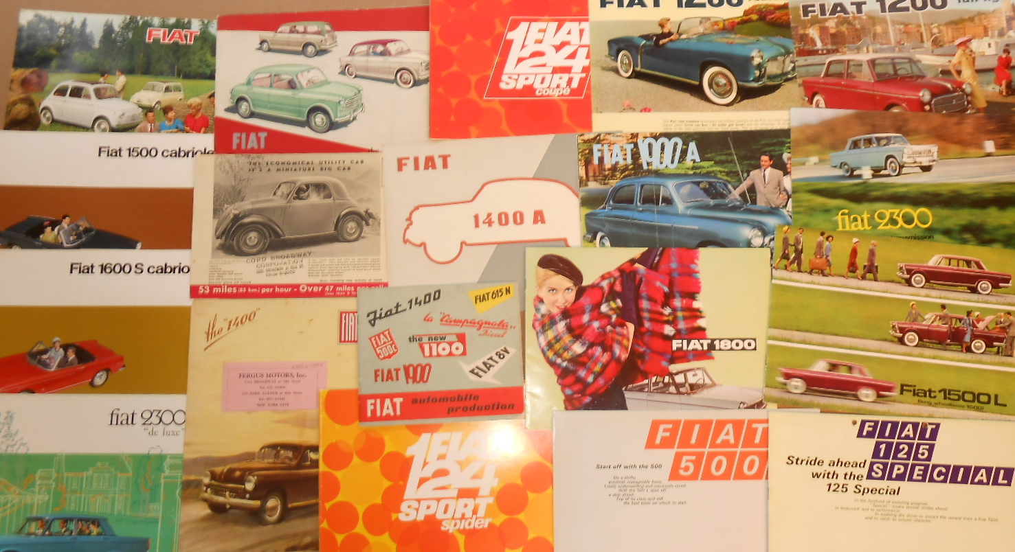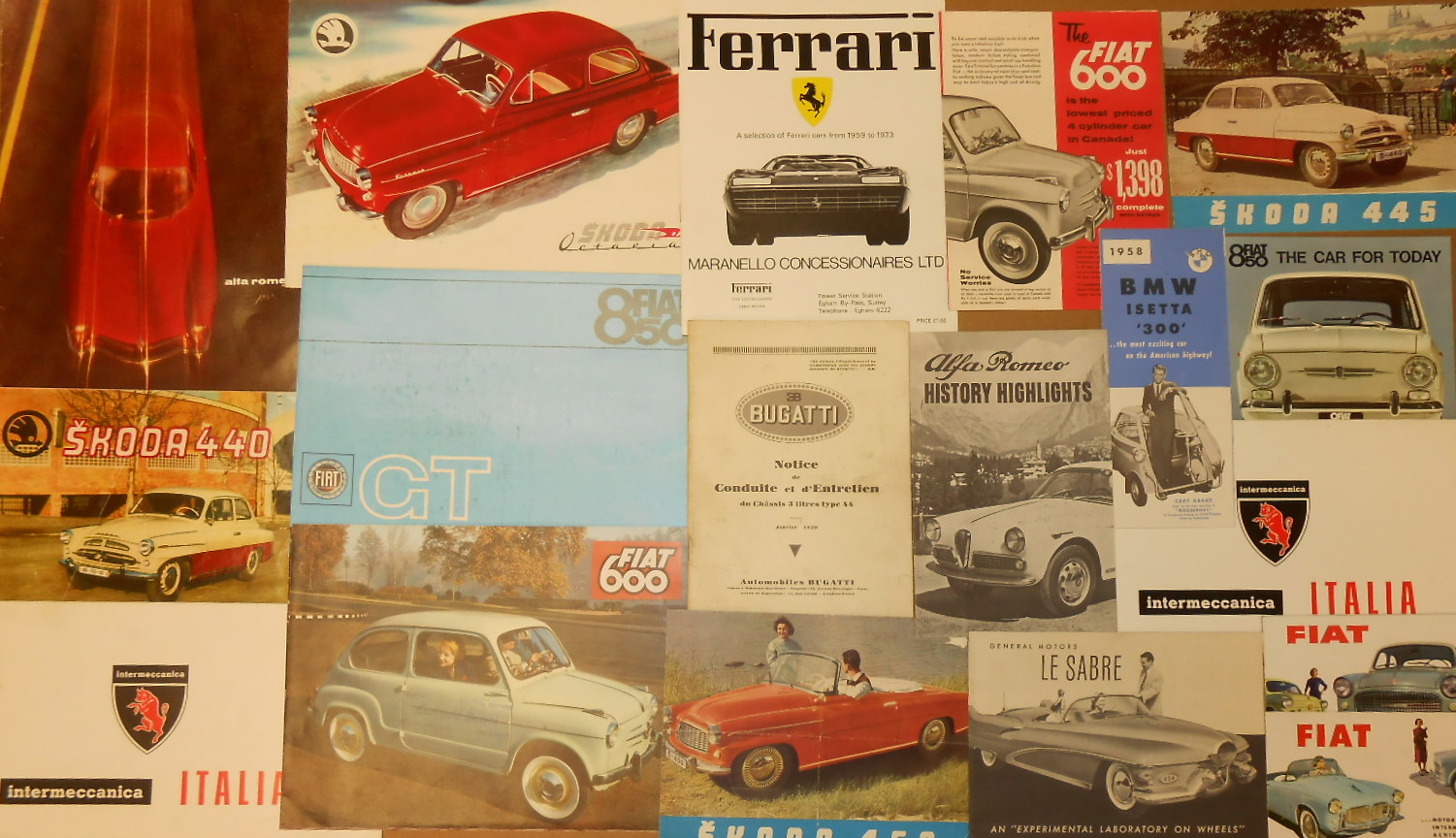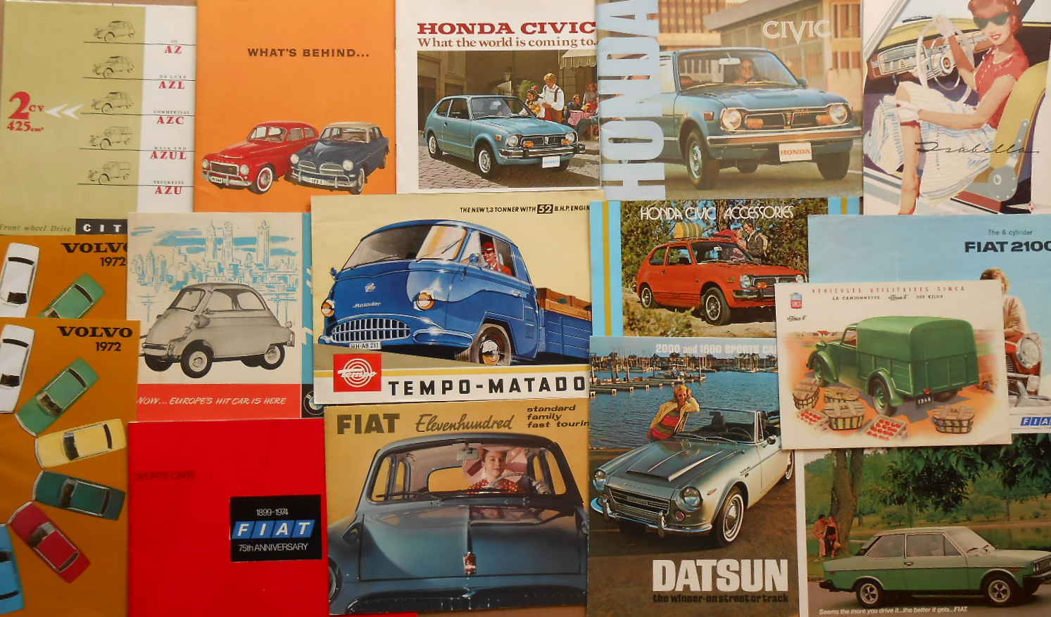 14 brochures – Fiat, Volvo, Tempo, Borgward, Simca, Citroen, Datsun Honda & nine Isetta factory photos