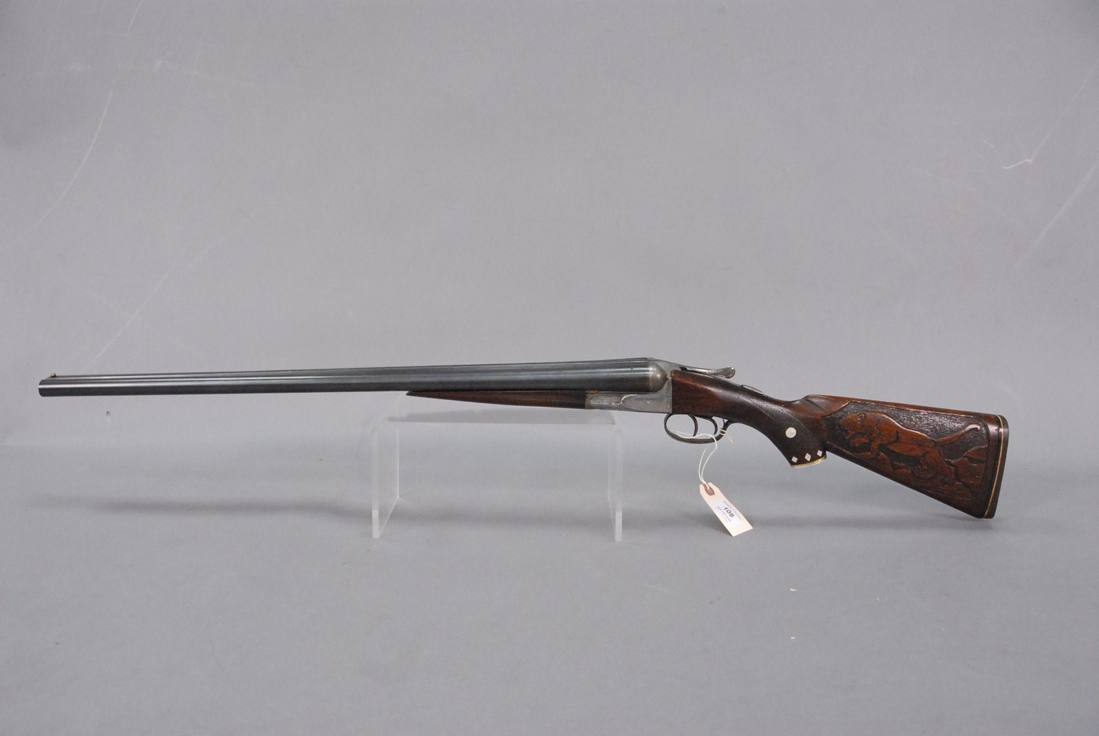 Fox Sterlingworth Deluxe shotgun, 12 gauge, side by side, 27 double barrels, stock having mother of pearl inserts and carved leaping cat. 141 SN-102883