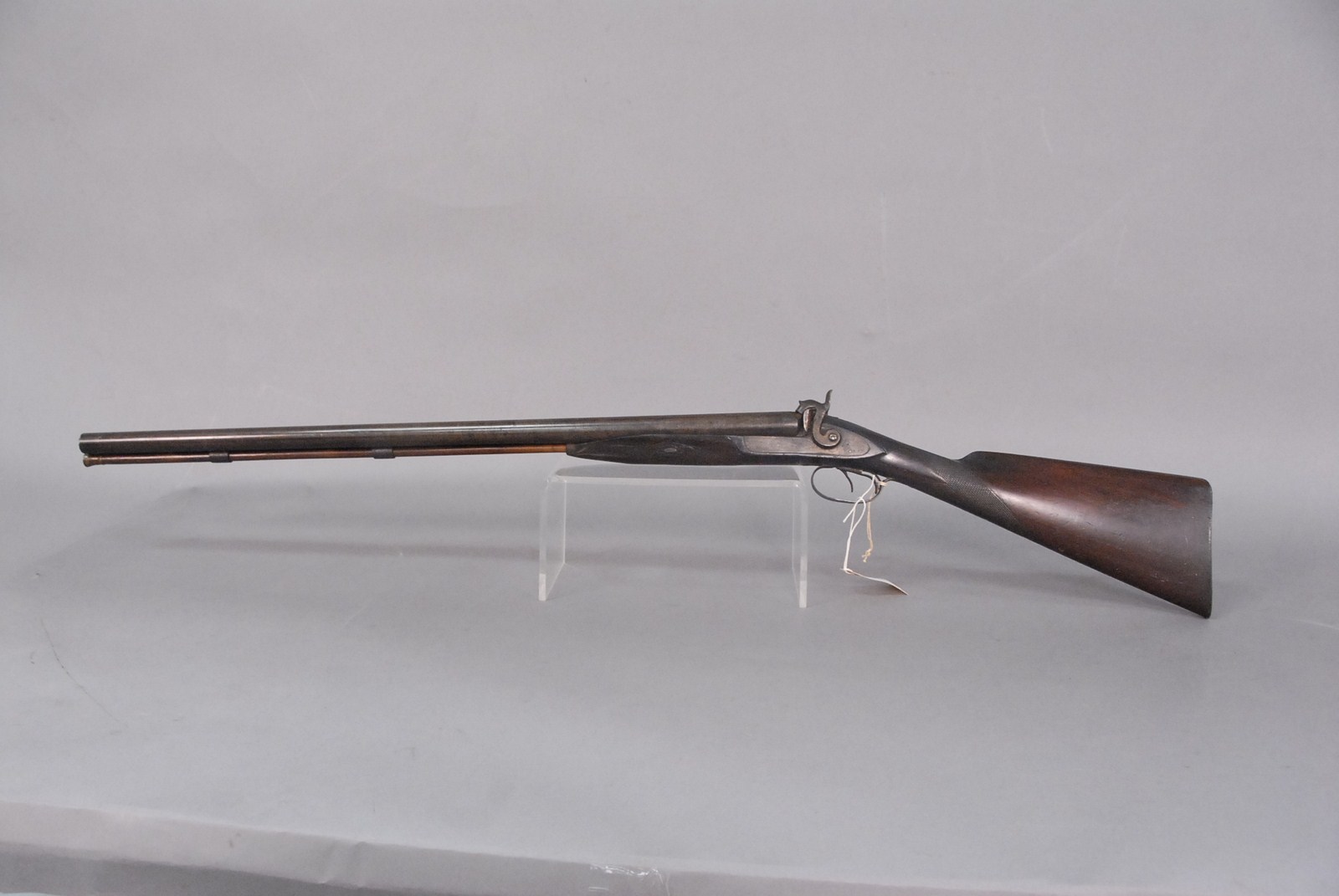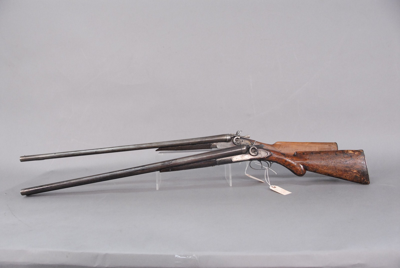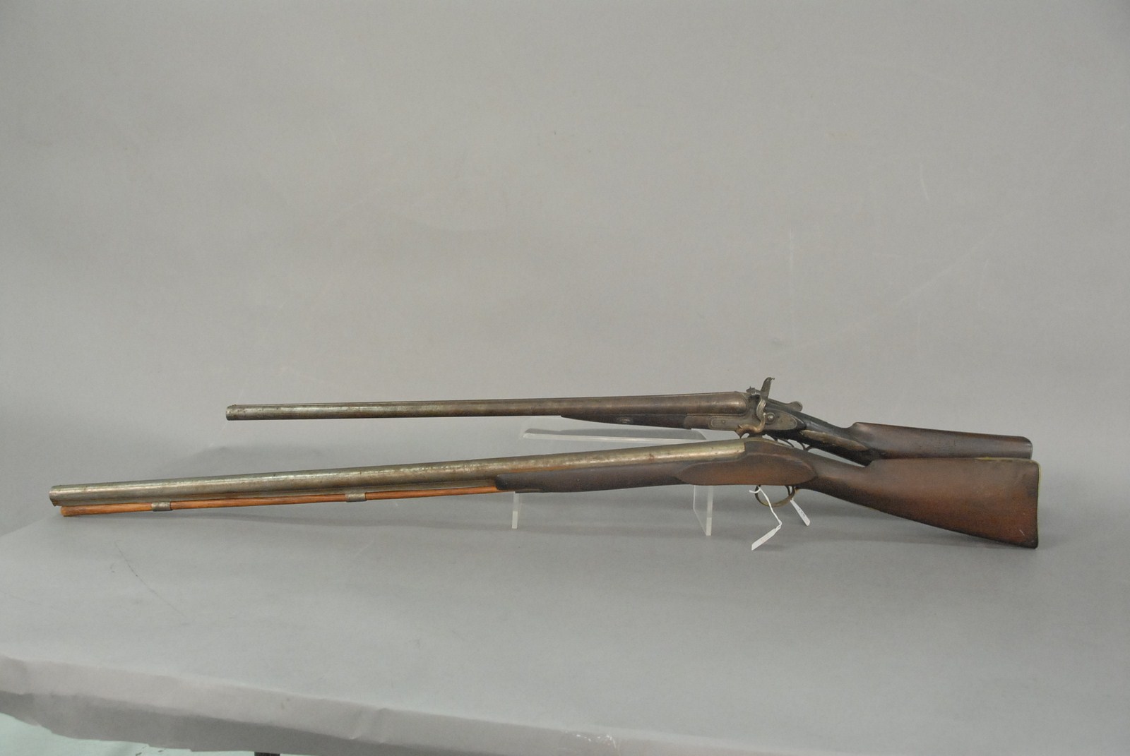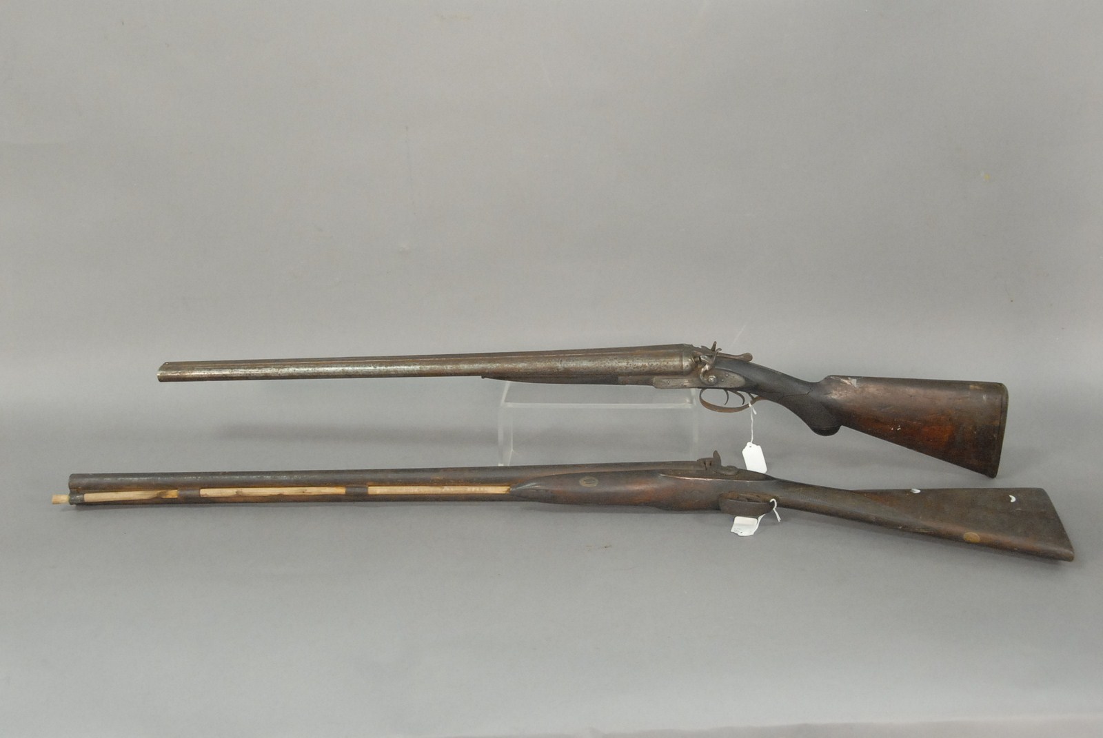 Two piece lot to include Bonehill London double barrell, 12 gauge hammer shotgun, broken butt stock and Double barrel percussion 12 gauge shotgun, as is.